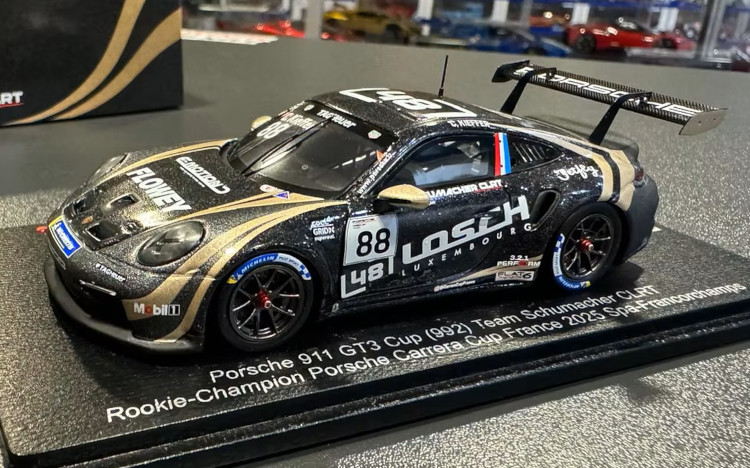 Drei neue Porsche-Sondermodelle, alle gefertigt von Spark, gibt es aktuell von Lux-Miniatures. Das Highlight hierbei stellt mir Sicherheit der Porsche 911 GT3 Cup MR des Teams Black Falcon von den 24h Nürburgring 2020 dar, Sieger der SP-Pro Klasse, gefahren von Carlos Rivas, Marek Böckmann, Tobias Müller und Maik Rosenberg. Mit diesem Modell hat Spark zum ersten Mal überhaupt ein Modell eines Porsche 911 GT3 Cup MR umgesetzt. Dazu kommt aus dem Porsche Carrera Cup Deutschland 2022 der Porsche 911 992 GT3 Cup von Dylan Pereira, eingesetzt vom Team IronForce by Phoenix Racing, sowie aus dem Porsche Carrera Cup Frankreich 2025 das von Schumacher CLRT eingesetzte Auto vom Sieger der Rookie-Wertung Chester Kieffer. Die drei Modelle sind ab sofort für jeweils 99,99 Euro bei Lux-Miniatures erhältlich.